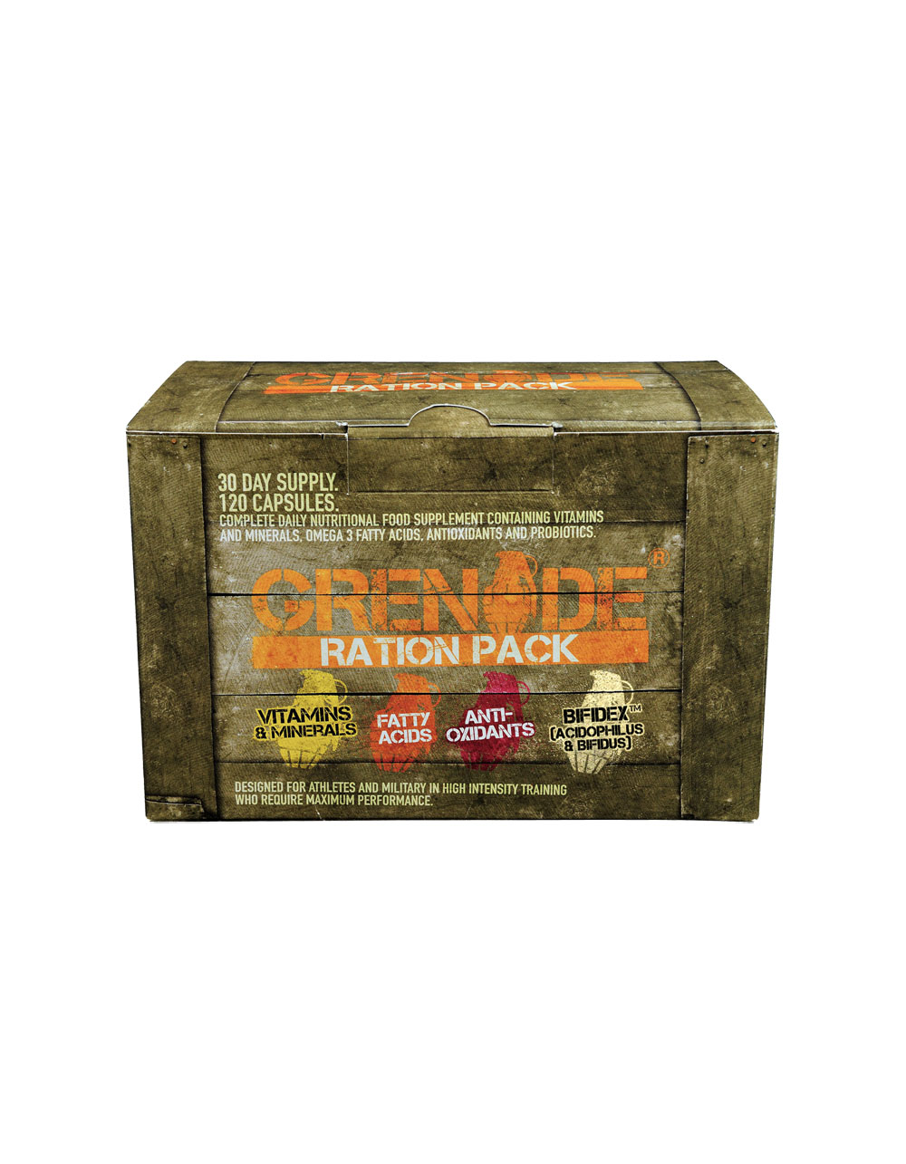 | Content | Grenade Ration Pack is a complete, daily food supplement, designed to provide comprehensive nutritional support to hard-training athletes and military personnel. Grenade believe that Ration Pack provides the ideal ratios and dosages of quality vitamins, minerals, trace elements, phytonutrients, essential fatty acids and probiotics required to create the best foundation for muscle growth, repair and overall health. In fact, it has been determined that the various ingredients in Grenade Ration Pack can contribute to: